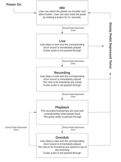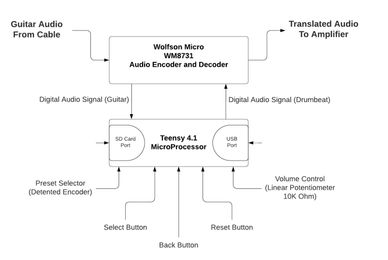 My team and I wanted to create a pedal that would allow guitarists to create and loop a drum pattern with their guitar and then use it to help build a song or just to practice along with it. Rotary encoder knobs select the drum preset they would like to use, such as: rock, jazz, pop, hip-hop, techno, etc.. To select/change the preset, we included a few buttons: select, back, and reset. The select button, when hovering over the desired preset, selects that preset for use when the guitarist is ready and puts the device in the Idle state where the guitar signal is passed through to the amp. To activate the pedal, the user must stomp on the main pedal button located at the bottom of the device to set it into Live mode. In Live mode, the notes on a guitar correspond to a drum beat, and any time the guitarist plays a single note, it translates and plays the drum beat mapped to that particular note. For example, E2 could map to a kick drum, A2 could map to a snare, C2 could map to a hi-hat, G3 could map to a cymbal, and so on.