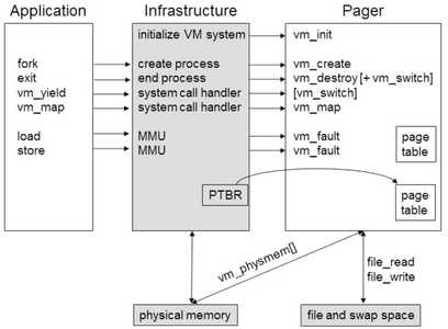 To gain an appreciation for the power of abstraction, indirection, and redundancy -more main themes - my team and I were tasked with designing and implementing a memory pager. This program manages application processes' virtual address spaces. The infrastructure we implemented (summarized by the image on the right, or above if on mobile) enables applications to create, copy, and destroy address spaces, allocate space in an existing address space, and switch between addresses. It further implements the interrupt handler for memory faults.